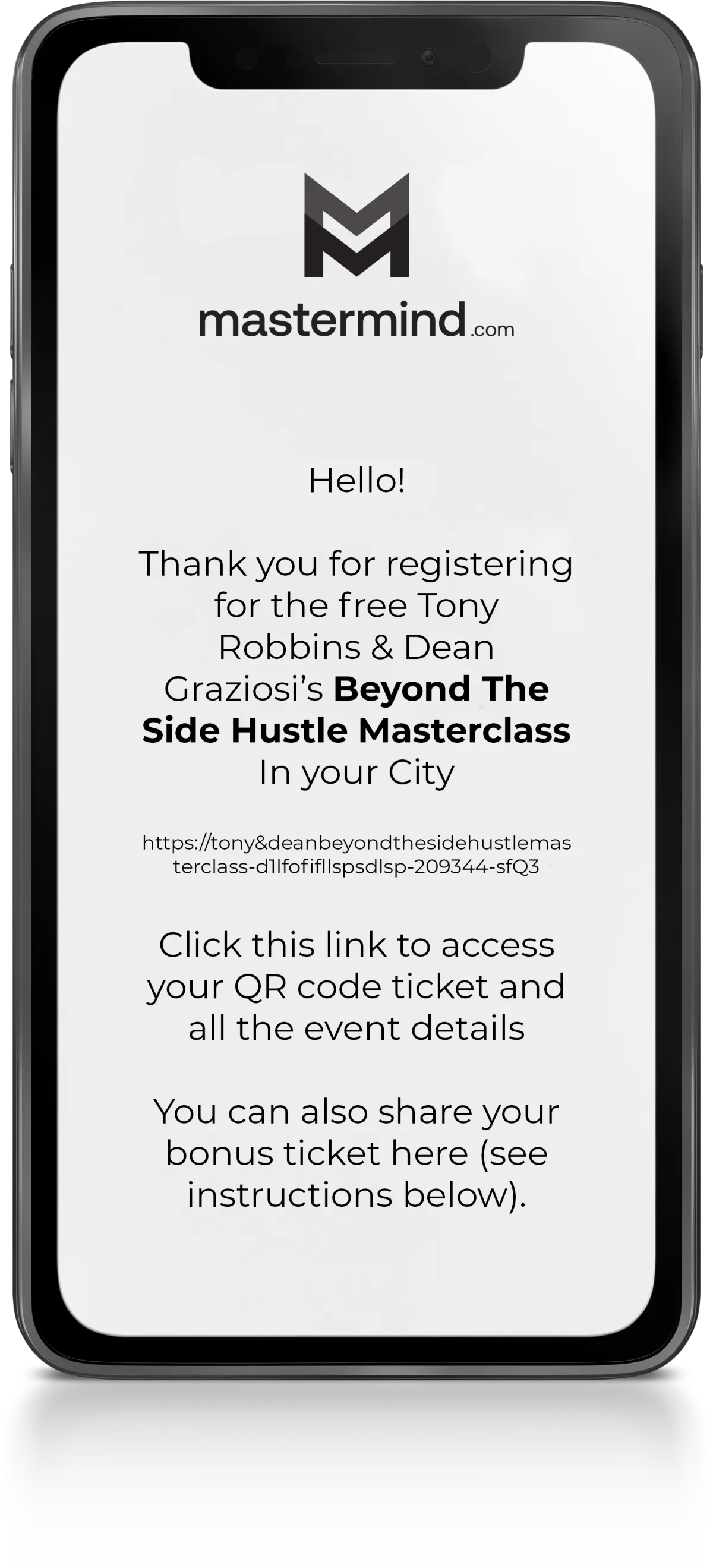 [Hi, I got free tickets for the Tony Robbins and Dean Graziosi Beyond The Side Hustle masterclass here in <city> and I would love to take you. It’s on [date] at [time]. Let me know if you want to come?